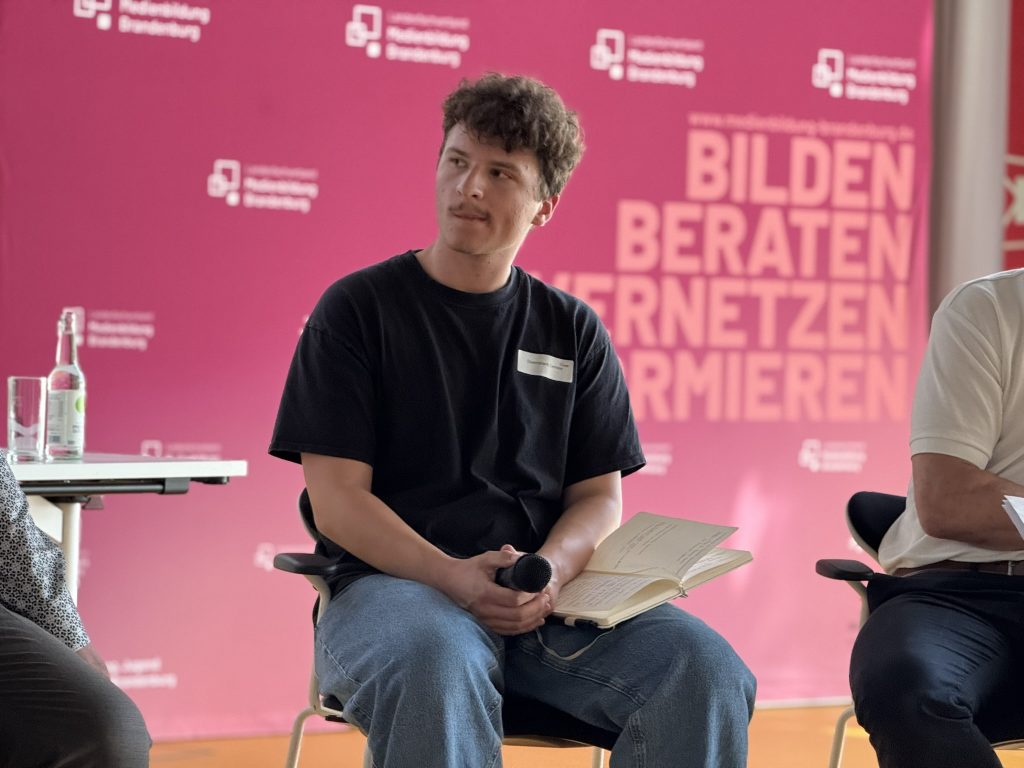 In der anschließenden Podiumsdiskussion, moderiert von T!na Knop, diskutierten Vertreter*innen aus Politik und Praxis über die konkrete Umsetzung digitaler Jugendarbeit in Brandenburg. Auf dem Podium saßen neben dem Keynote-Speaker Georg von Rechenberg: